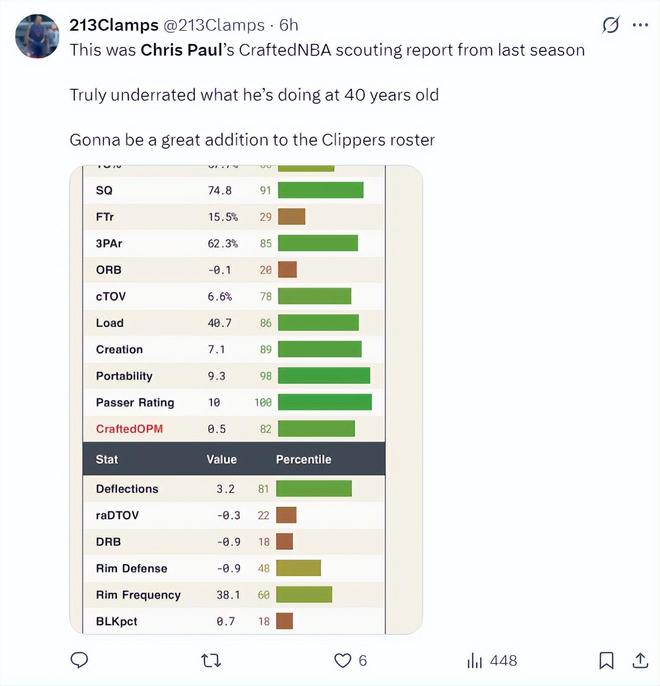 美媒:这是上赛季保罗的数据,他依旧起到正向作用,40岁的他还能有这样的表现实在是令人叹服,他会成为本赛季快船一大亮点。