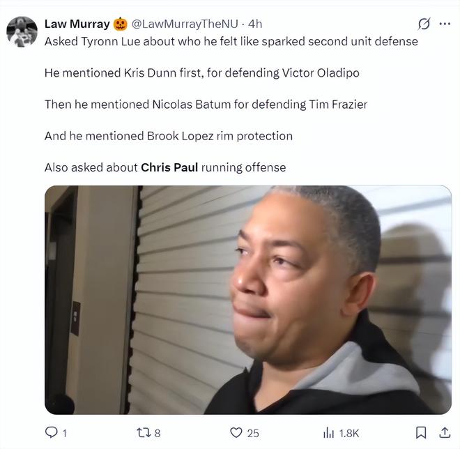 泰伦卢在赛后的采访中也评价了保罗在组织进攻端为球队做的贡献。